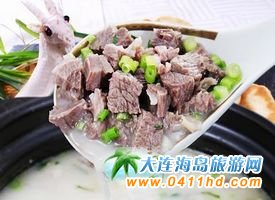 金州特色小吃——羊湯,登上大雅之堂,走進了三星級賓館,想到金州賓館喝羊湯的人需要提前預訂,這已經成為金州餐飲界一道靚麗的風景線。金州賓館的全羊湯是由國家高級烹調技師張學安在總結先人的基礎上創制出的,具體制作方法為:把凈羊去骨,羊雜處理干凈,將鮮羊肉及羊雜分別投如沸水鍋中飛水、去血污,之后,另起鍋加冷水,投入羊肉及羊雜,煮至五成熟后取出羊雜改成1厘米見方的整齊小丁,羊肉熟后也取出切成1厘米見方的丁,再投入頭骨、棒骨、脊骨熬制老湯,加入30余種調料用高壓夾層鍋煨煮8個小時,做兩次加工而成。食用時,要放些胡椒粉、蔥花、香菜、米醋、精鹽等。其特點為:觀其白,聞其香,嘗其鮮,食不膩。