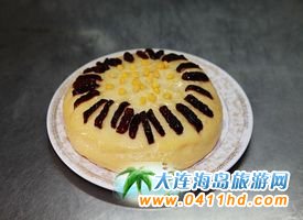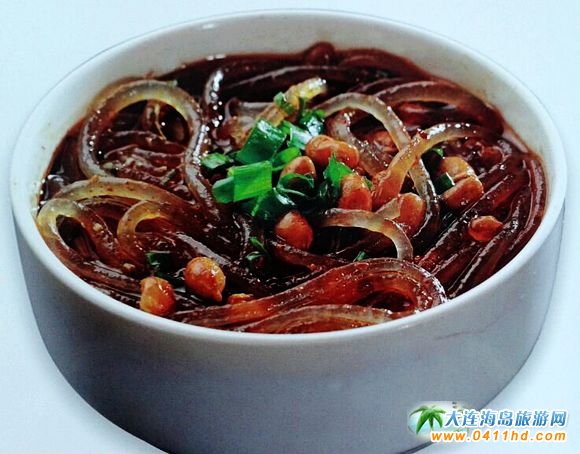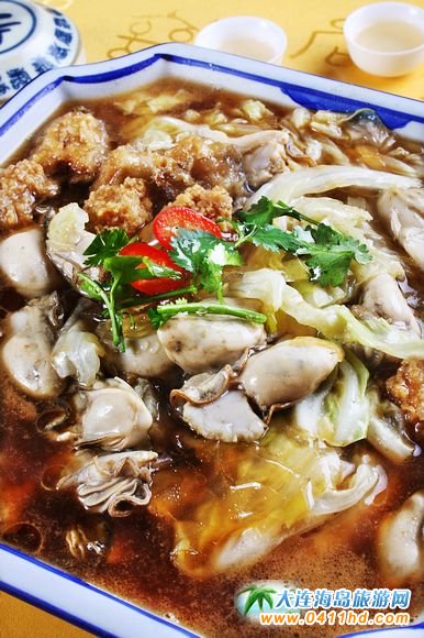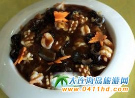 三鮮燜子 燜子是大連的特色小食,是用地瓜淀粉熬制出來的,結成塊后,掰成小塊,然后用油煎成兩面成硬皮。后來有廚師根據大連人愛吃海鮮的特點研發了“三鮮燜子”,由于口味頗受歡迎,慢慢演變為金州老菜特色之一,其口味咸鮮、香嫩適口。