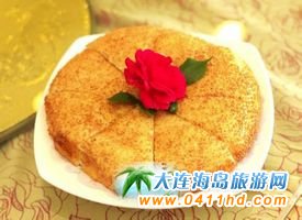 黃金大餅是每桌客人必點的主食,此餅外酥里嫩,配上芝麻和咸蛋黃,非常美味。具體作法是將普通面粉、牛奶、酵母、白芝麻等所有原料混合揉勻發酵到兩倍大,發酵好的面團排氣在揉成一個圓形按扁,表面刷點水均勻的裹上白芝麻進行二次發酵,將再次發酵好的面團放在蒸鍋里蒸15分鐘,放涼炸至金黃即可。