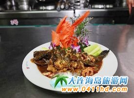 漁村特色燉魚 這道菜以鮮百合、青紅椒末等為輔料,調料主要是鹽、味精、耗油、糖、老醋和自制調味油。其口味是酸甜適口,營養開胃。與傳統燉魚相比,這道菜的特色之處是沒有用魚來烹香,而是加完高湯再燉魚,這樣魚肉會更細嫩;海螺和基圍蝦也帶來了不少的鮮味。