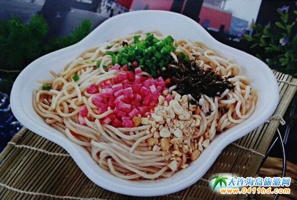 肉絲炸炒面也是金州老菜,也叫大炒面,工序比較繁雜。切面煮至八成熟,下油鍋炸至金黃色。再用沸水煮至回軟,加肉絲圓蔥調味料下勺煸炒而成。此菜的特點是軟硬適度,香氣撲鼻色澤金黃。