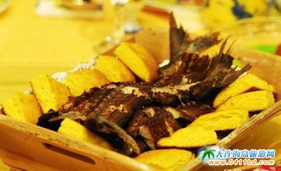咸魚餅子 勇杰大餅子咸魚店的咸魚餅子非常有名,其咸魚的制作方法為:選個大的魚,殺后,洗凈。剁下魚頭,將魚身用腌制鹽涂滿,放入盆中。放陰涼處,約一個星期,每天將魚翻個身。取出,用繩穿上,涼在陰涼處,風干即可。放在鐵鍋里,擱少許油,烤得外焦里嫩,和餅子一起吃味道獨特。