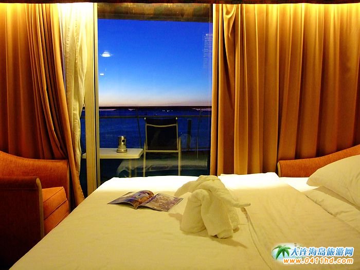 海洋神話號郵輪豪華套房面積約44㎡,配備有可以并和成雙人床的兩只單人床,并且配有可展開作為床鋪的長條沙發(fā),最多可容納3人(或2大人2兒童)入住,海景套房最大亮點是房間的位置以及露天觀景陽臺,位置都在郵輪的第八層,在船尾的位置,不同于普通房間在船艙的兩側(cè),因此觀景角度視覺非常突出。房間內(nèi)配有私人浴室,冰箱,化妝臺,電吹風(fēng),電視機(jī),電話,110V-220V的電源,保險柜,躺在床上,既可以透過落地玻璃窗觀賞到外面的海景。