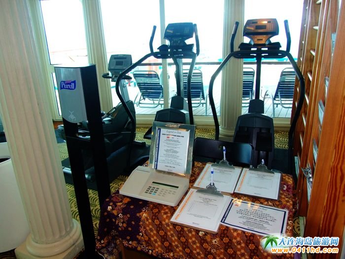 在海洋神話號郵輪上,為游客配備了免費的健身房,各種健身器材應有盡有,一排跑步機以及登山機就擺放在臨窗的位置,當您在機器上運動的時候,抬頭即可觸望到外面碧藍的大海和天空,那種視覺上的享受的確是與過去接觸過的健身房所無法比擬的。