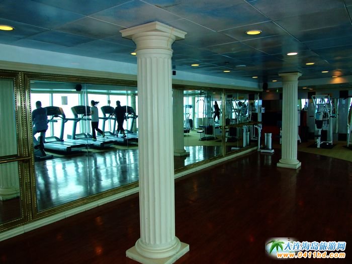在海洋神話號郵輪上,為游客配備了免費的健身房,各種健身器材應有盡有,一排跑步機以及登山機就擺放在臨窗的位置,當您在機器上運動的時候,抬頭即可觸望到外面碧藍的大海和天空,那種視覺上的享受的確是與過去接觸過的健身房所無法比擬的。